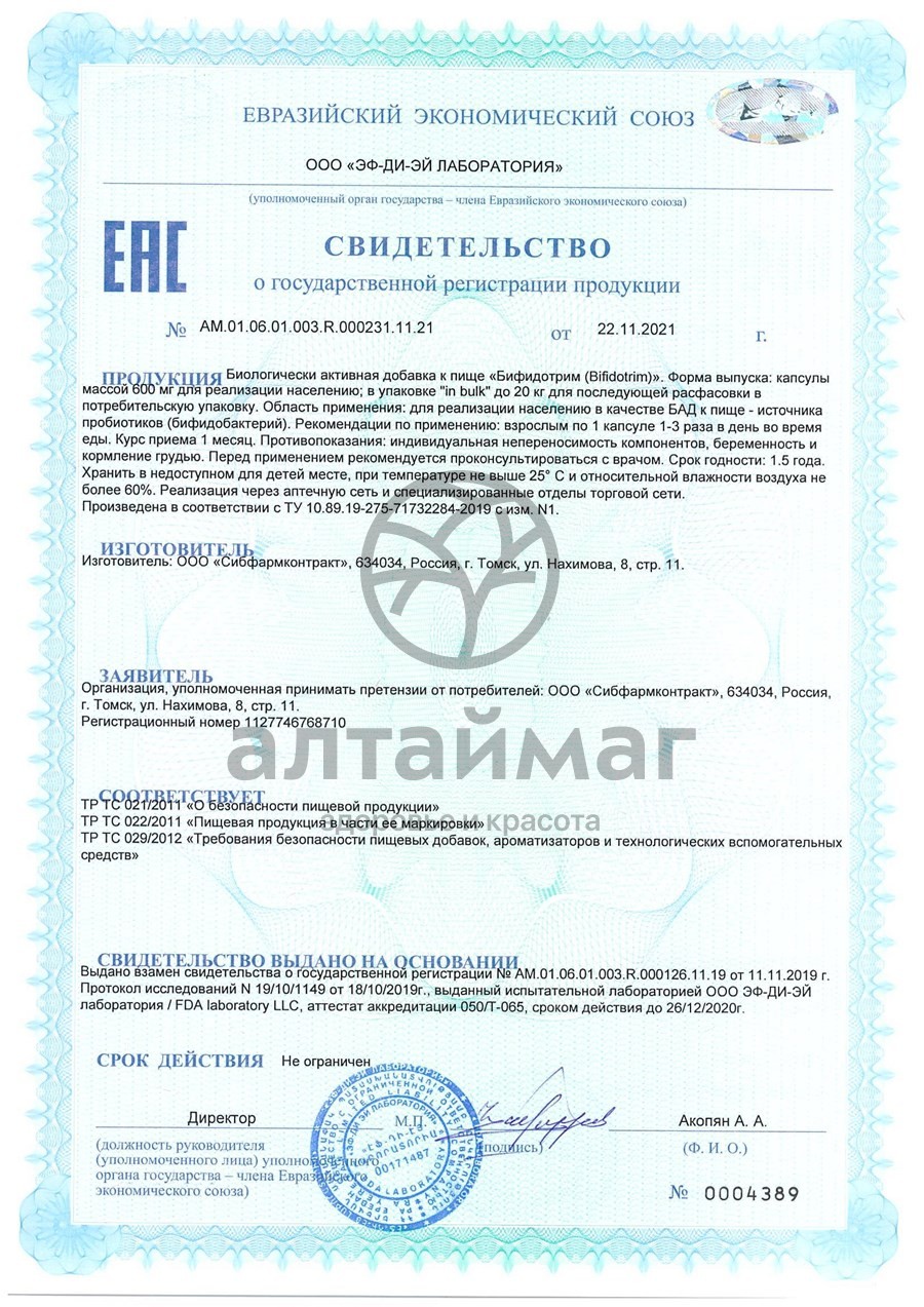 Бифидотрим - комплекс живых специализированных штаммов бифидобактерий человека и их метабиотиков, постбиотиков, способствующий росту индивидуального микробиоценоза человека, стимуляции противовирусного, противомикробного иммунитета.