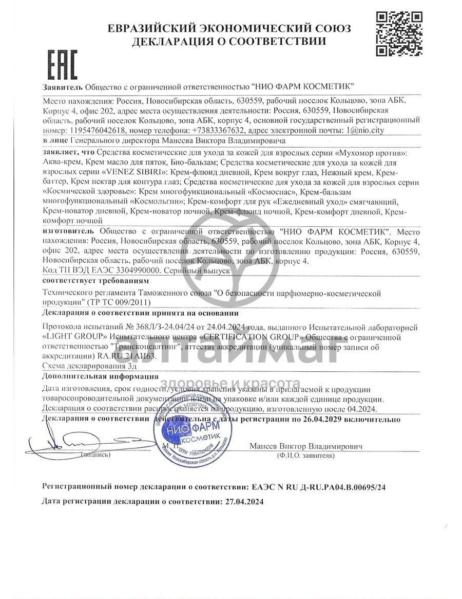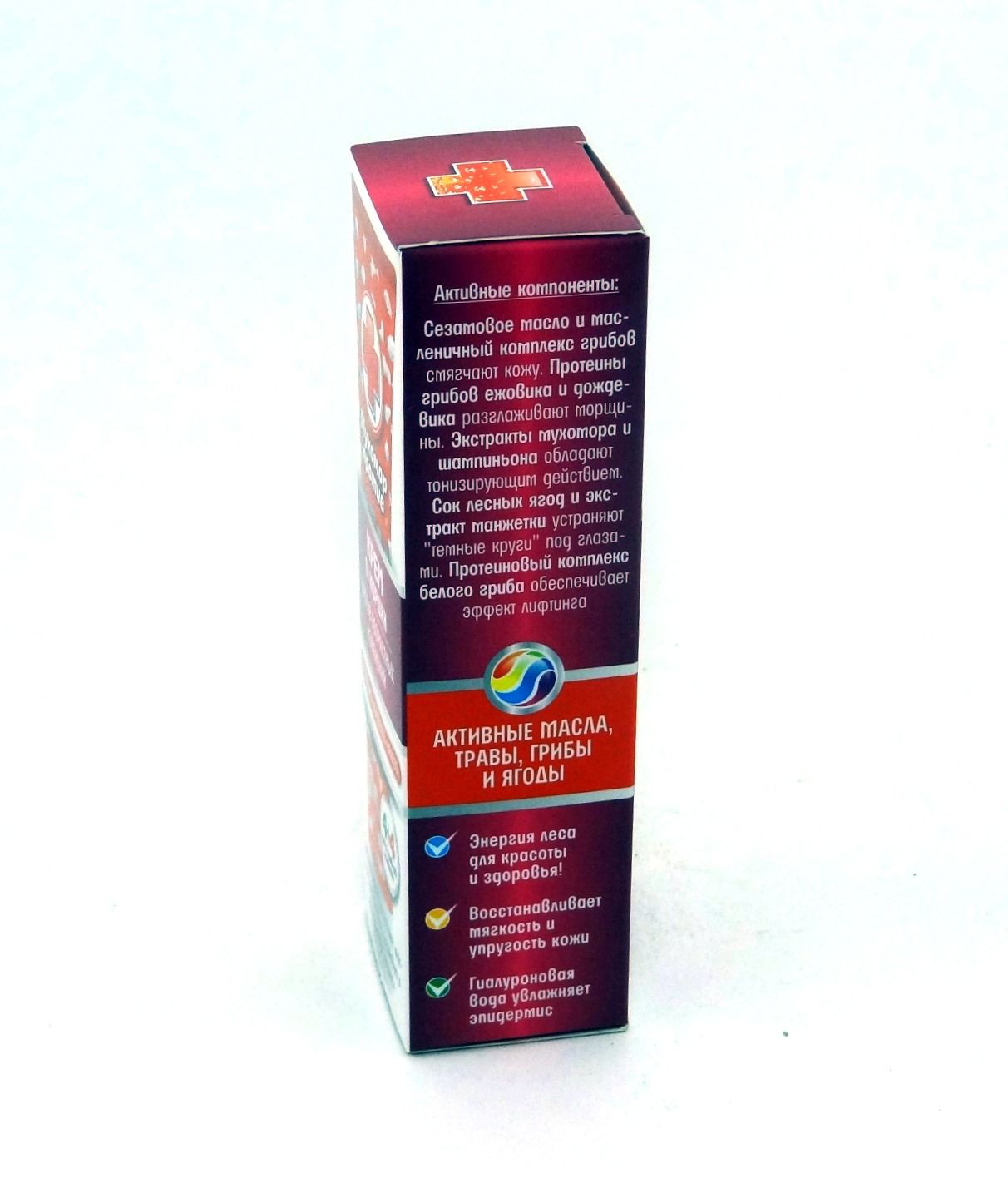вода родниковая, косметическая основа «ERILEM FITO», масло семян черной смородины, аллантоин, эмолент цетиол, витаминный комплекс лесных ягод, Д-пантенол, увлажняющий комплекс «Коньяк Маннан», экстракт золотого корня, витамин А, фитоаминный грибной альянс (экстракт мухомора, протеины белого гриба, настой шампиньона, масленичный комплекс рыжиков и маслят, экстракт полыни и мимозы, гидролизат крапивы, «коктейль» аминокислот: лейцин, валин, аргинин, лизин, антиоксиданты: витамин Е-ацетат, эфирное масло розмарина), отдушка косметическая, цитрат серебра.