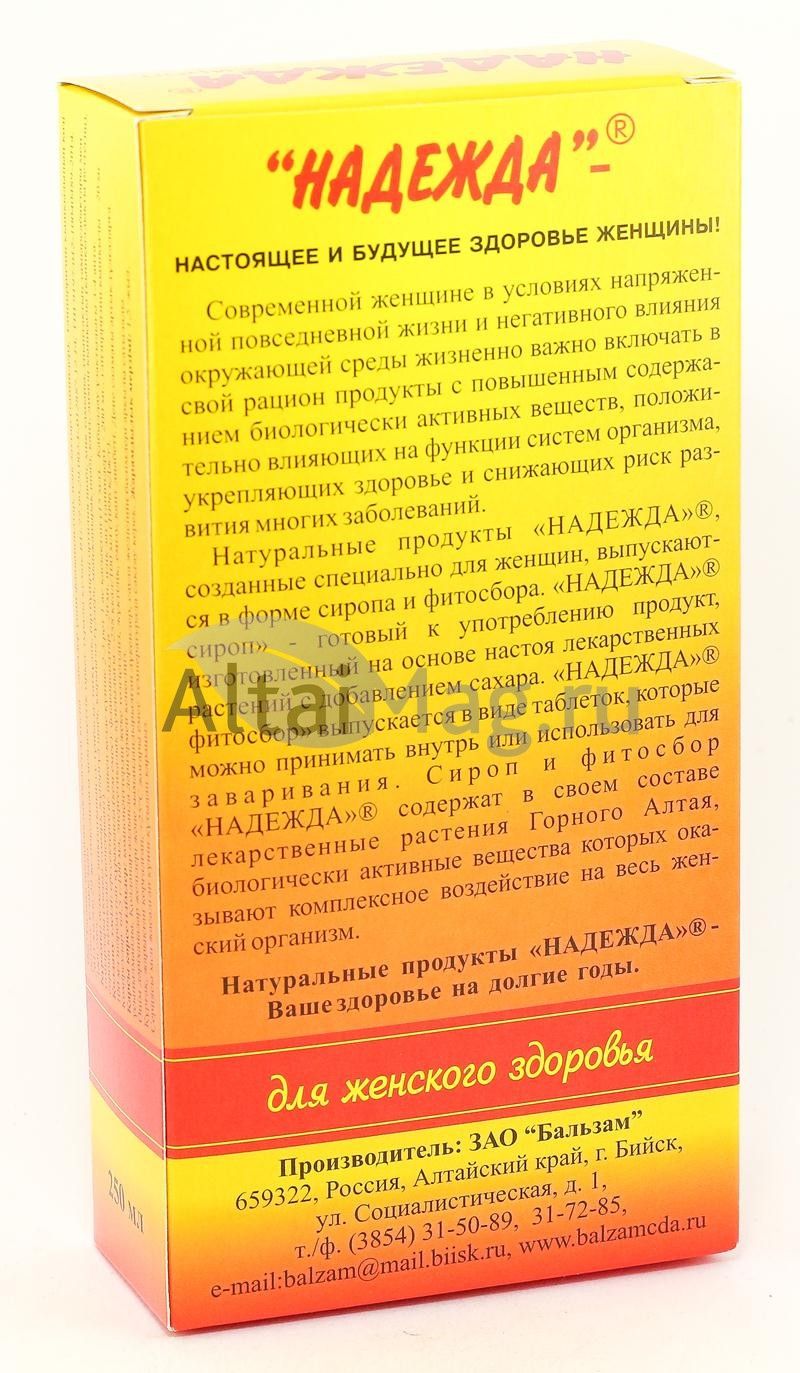- Купите Сироп Надежда (при мастопатии) в Симферополе по доступной цене 390 ₽ с доставкой на дом или заберите Ваш заказ в Симферополе из ближайшего пункта выдачи, сделав заказ на AltaiMag.ru.
