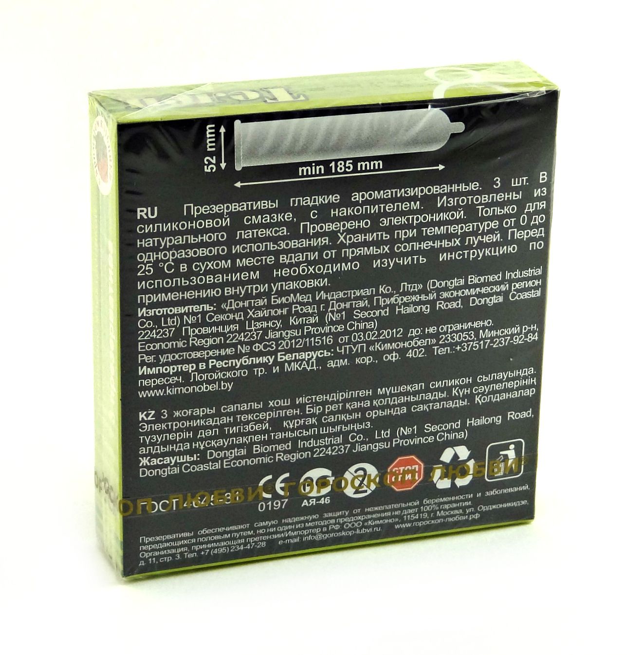 3 высококачественных презерватива в силиконовой смазке. В блоке 24 упаковки ( по 2 штуки каждого знака зодиака) гладкие, точечные, ребристые.