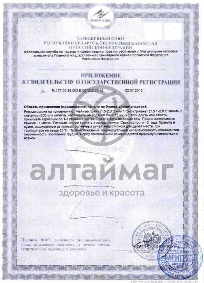 1 фильтр-пакет по (1,5-2,0 г) залить 1 стаканом (200 мл) горячей воды, настоять на водяной бане 15-20 минут, процедить, принимать взрослым по 1/3 стакана 3 раза в день во время еды. Готовый настой хранить в холодильнике. Продолжительность приема – 1 месяц.